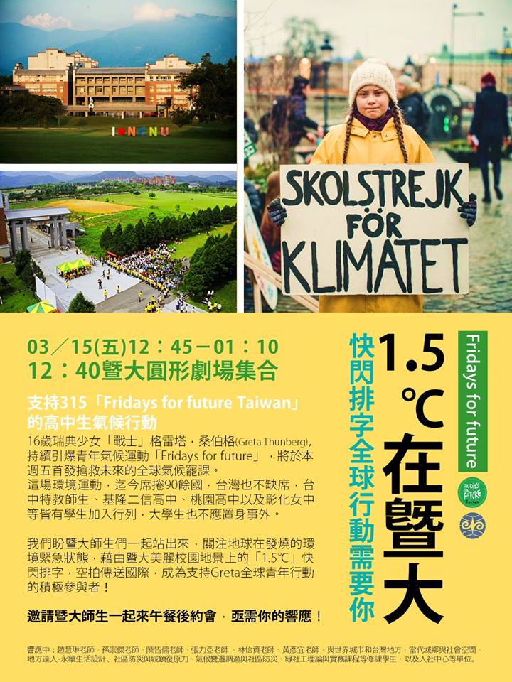 活動介紹:支持315「Fridays for future Taiwan」的高中生氣候行動,國立暨南大學通識課程「氣候變遷調適與社區防災」任教老師林怡資;「社區防災與城鎮復原力」任教老師陳皆儒、張力亞;「當代城鄉與社會空間」、「世界城市和台灣地方」任教老師趙慧琳,以及「地方達人-永續生活設計」任教老師孫崇傑,共同發起「1.5℃在暨大」的快閃排字全球氣候行動!