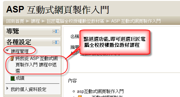如何退選 [ 巨匠電腦全校授權數位教材 ] 課程 by admin 系統管理 - Wednesday, 27 March 2013, 3:59 PM Number of replies: 0 如何退選 [ 巨匠電腦全校授權數位教材 ] 課程, 請參考下圖: Permalink
