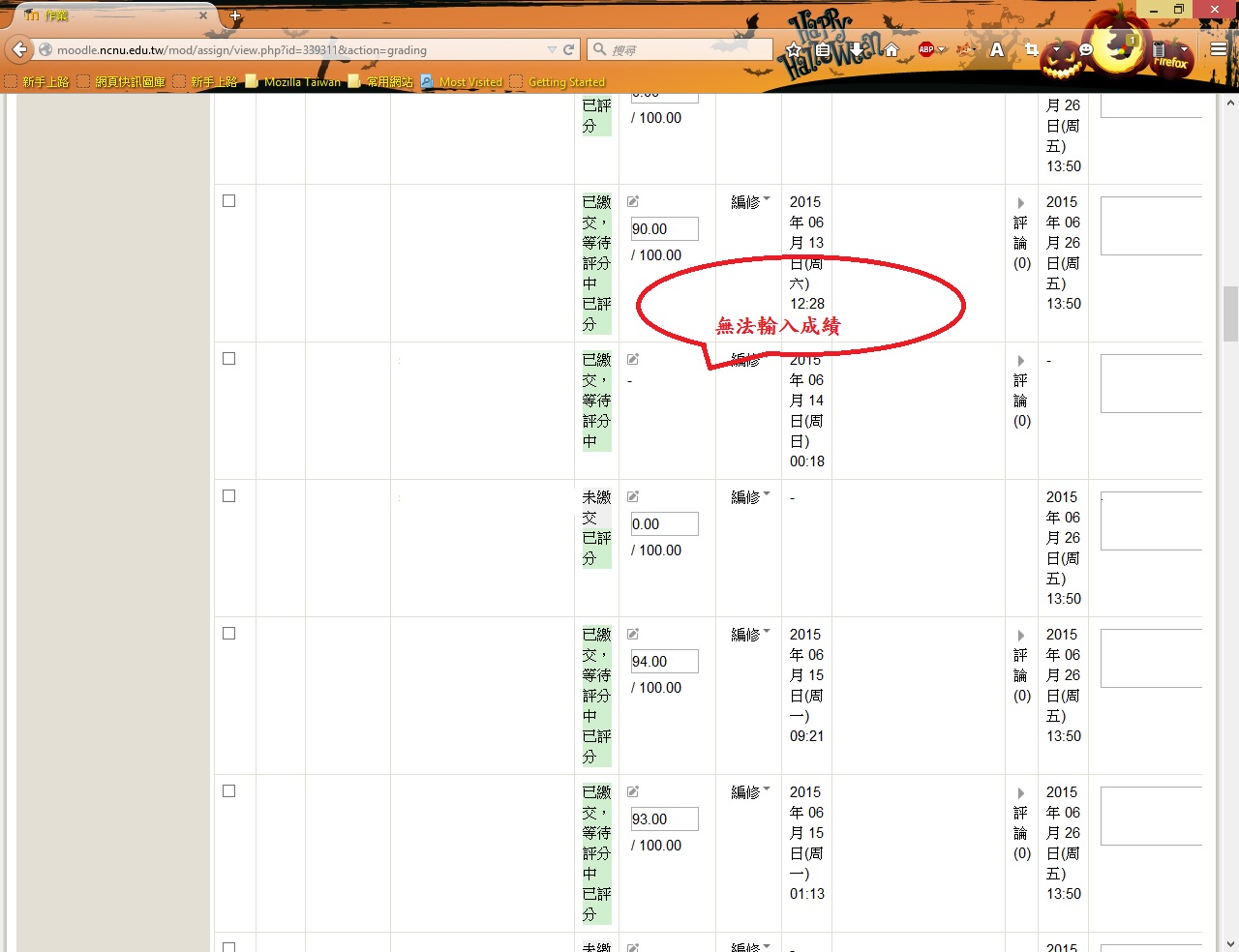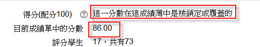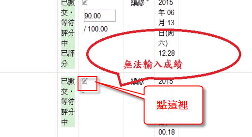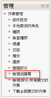In reply to 103213501 黃業樺 回應: 無法輸入成績 일요일, 28 6월 2015, 12:27 AM 에 admin 系統管理 씀 Moodle 每一個課程有一個總成績冊, 它的優先權高於各項活動的原始成績, 可能是此課程的教師或 TA 在那裡輸入此生此份作業的成績, 你可以點: 可以看到 成績冊功能在這裡 計網中心系統組 簡文章 Permalink 앞글 보기 In reply to admin 系統管理 回應: 無法輸入成績 일요일, 28 6월 2015, 10:46 AM 에 103213501 黃業樺 씀 OK,我知道了,謝謝簡組長的解惑 Permalink 앞글 보기