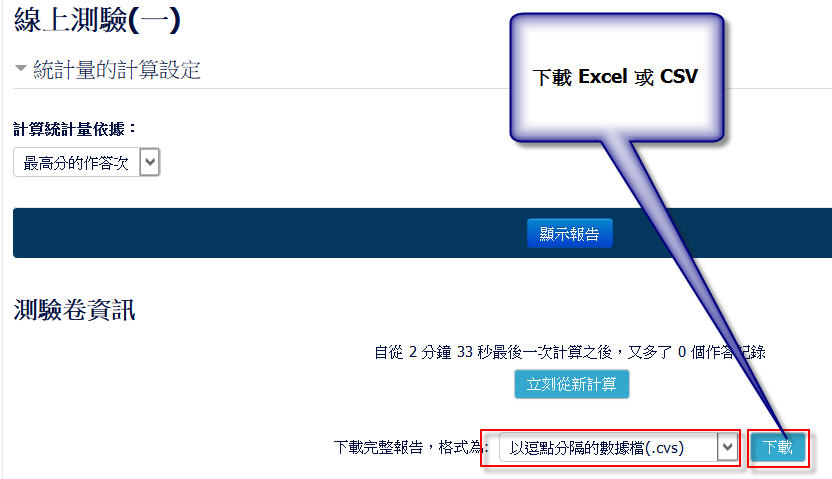 回應: 測驗卷題目能看所有同學錯什麼選項嗎? oleh admin 系統管理 - Isnin, 8 Oktober 2018, 1:48 PM Number of replies: 0 您可下載學生的作答統計結果(excel 或 CSV), 如: Permalink Show parent