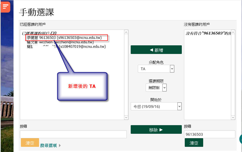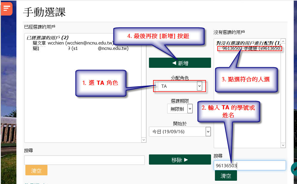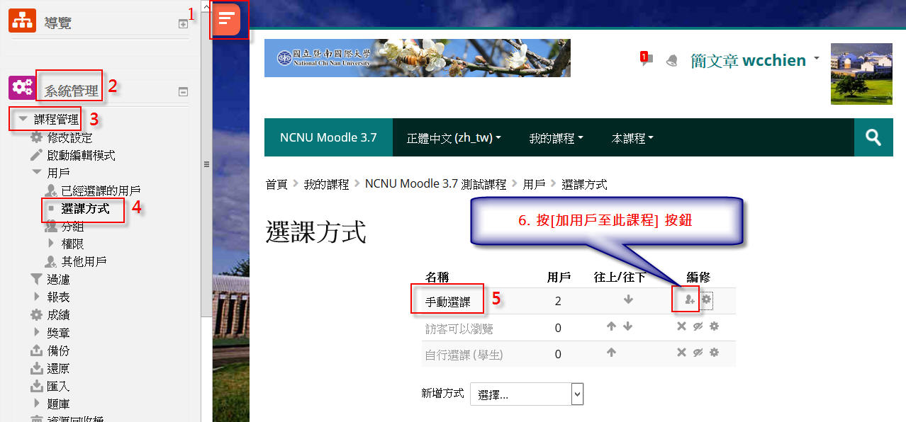 Moodle 3.7 新增課程 TA 或其他角色方法-1 由admin 系統管理發表於2019年 09月 16日(週一) 22:59 Number of replies: 0 STEP 1: 1. 打開左邊區塊 2. 點開 [系統管理] 3. 點開 [課程管理] 4. 點開 [選課方式] 5. 6. 點 [手動選課] 的 [加用戶至此課程] 按鈕 STEP 2: 如下圖 STEP 3: 永久鏈接